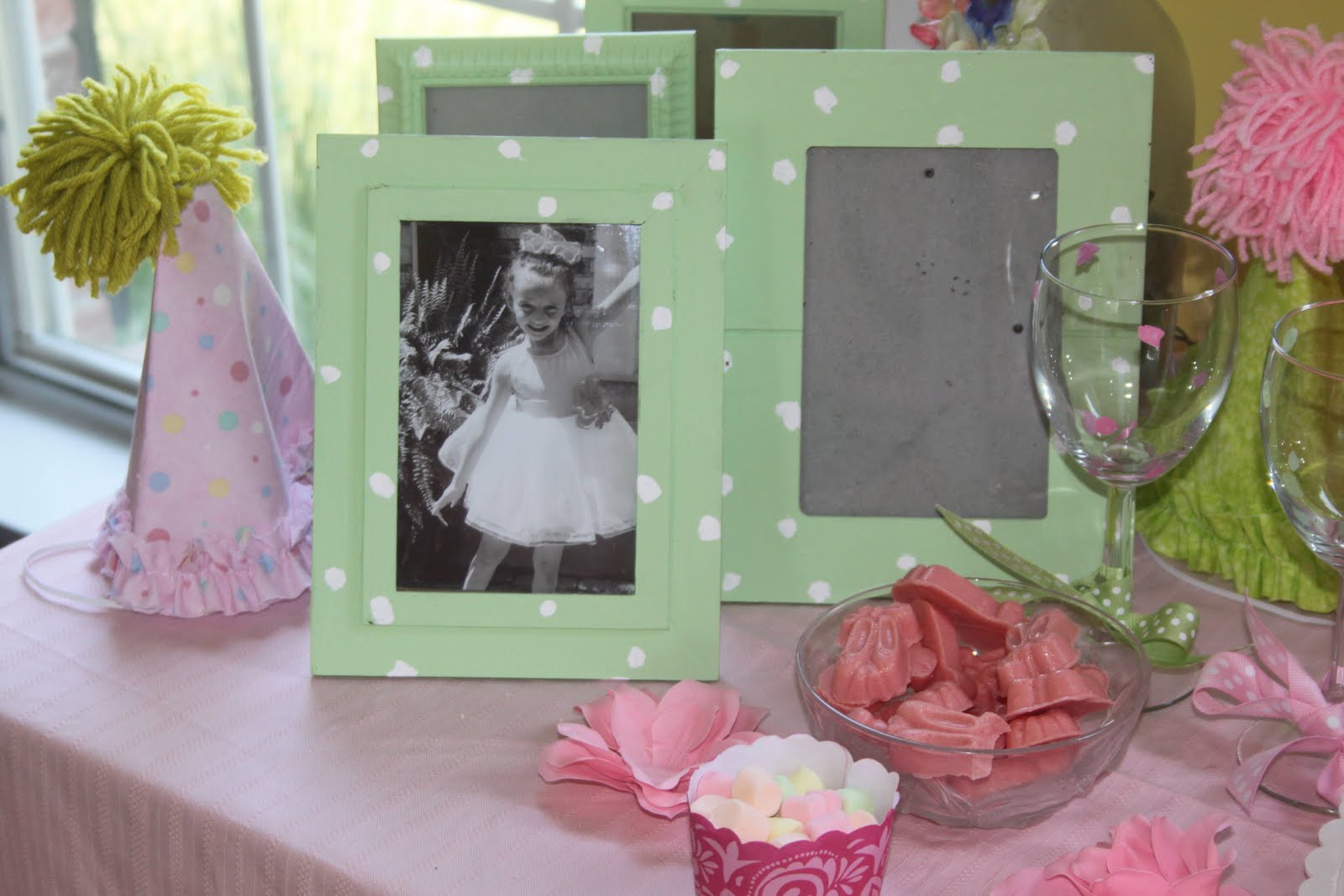 The table was set with polka dot glasses to matcg each apron. Bright colored candy was sprinked on the table. Each girl also had a matching napkin.
